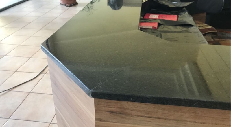 Mesón de recepción con Sobrecubierta Granito Negro San Gabriel 4 m largo con base en Melamina Caramel.