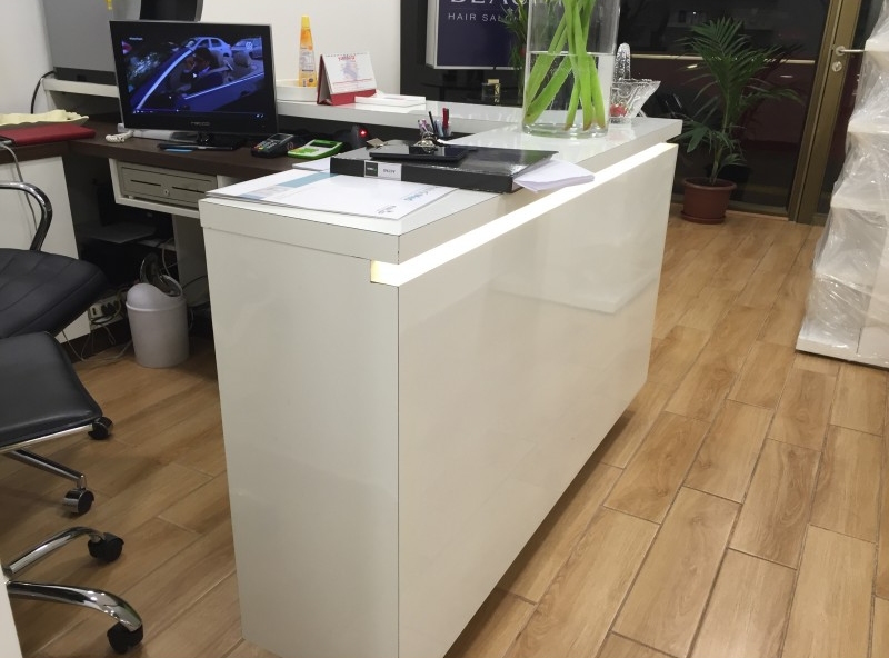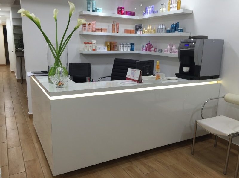 Mesón de Recepción Salón de Belleza «More Beauty» Las Condes, Revestimiento Fórmica blanca y Sobrecubierta Cristal templado.