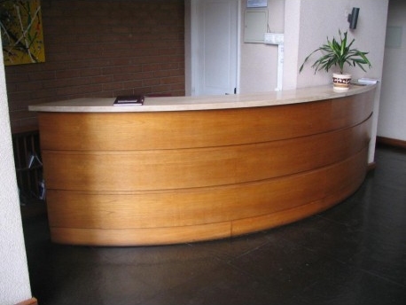 Mueble Curvo enchapado en madera barnizada con cantería y Sobrecubierta de Mármol Travertino.