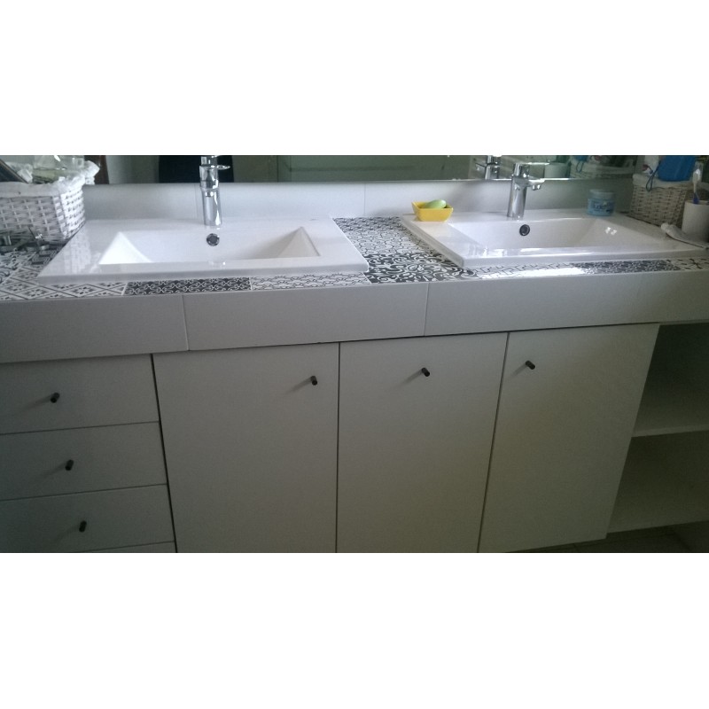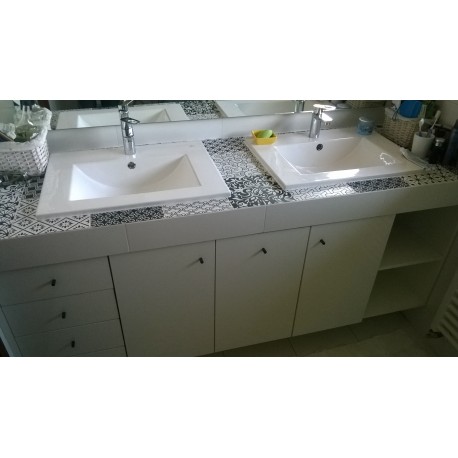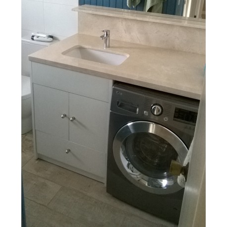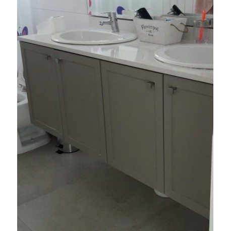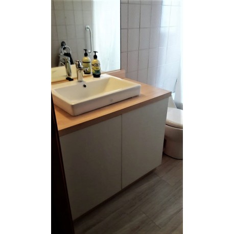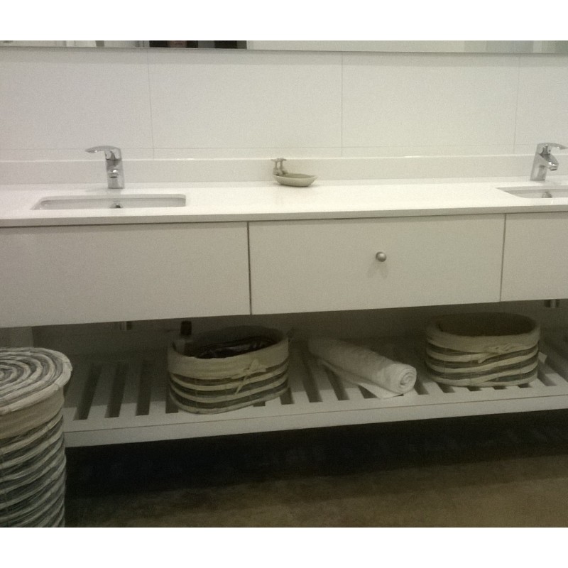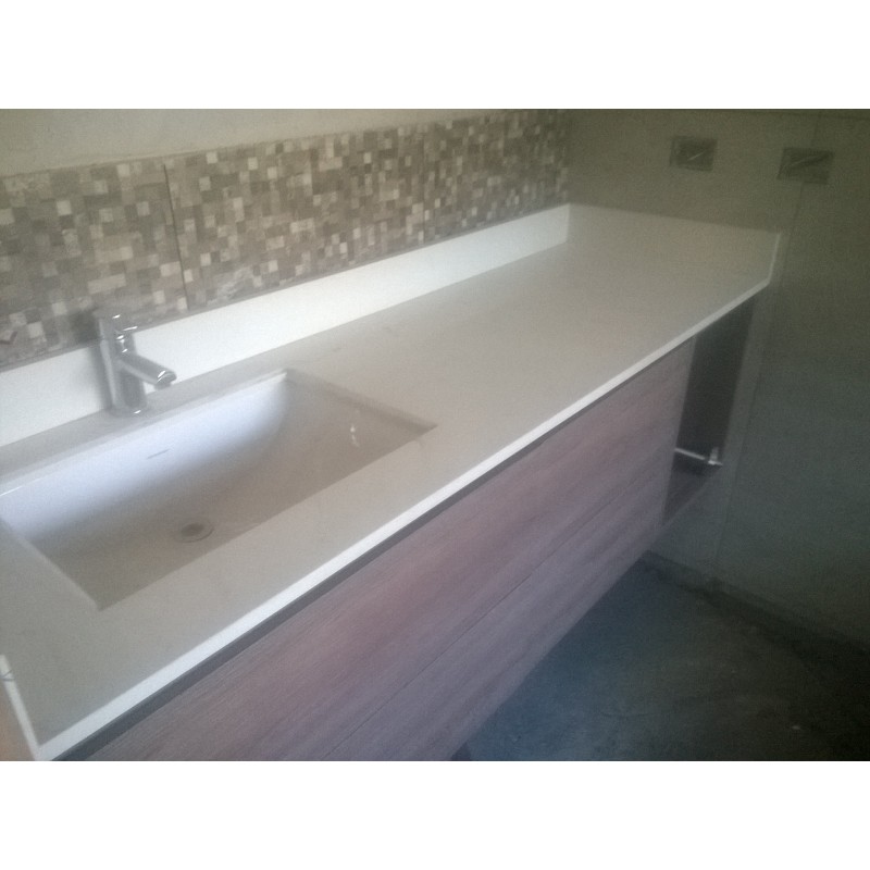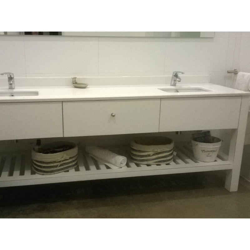 MUEBLE EN MADERA NATURAL PINTADO BLANCO CON CUBIERTA DE CUARZO BLANCO.