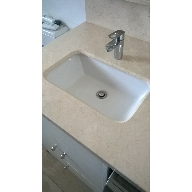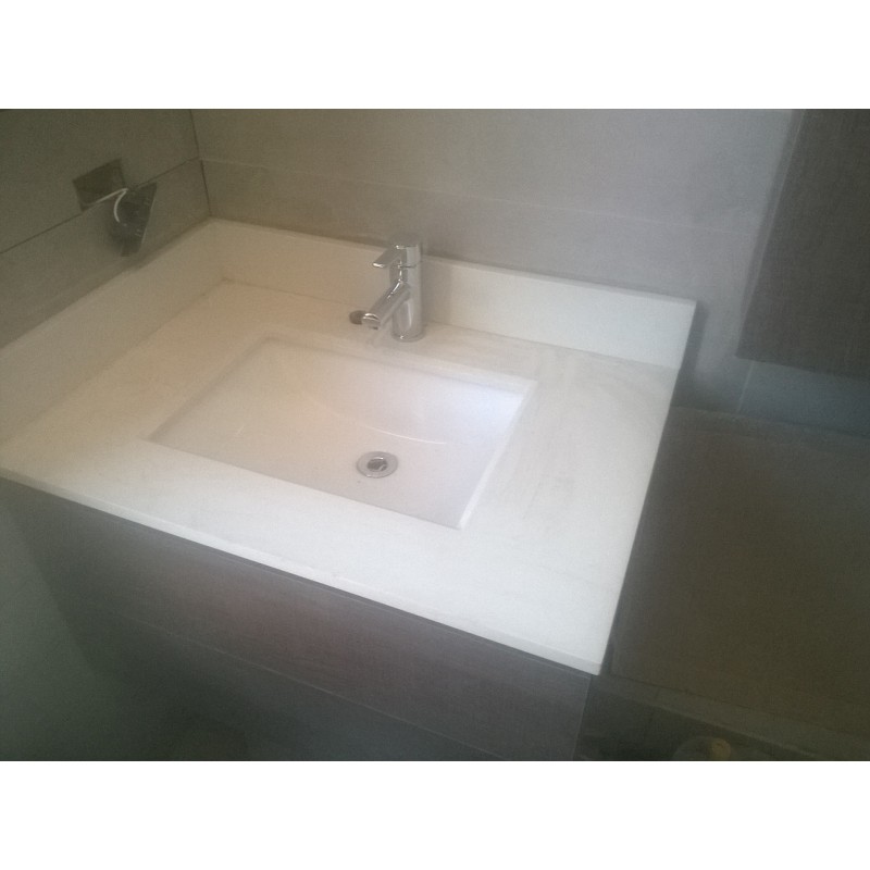FRENTES ENCHAPADOS LAMINADO BLANCO POLAR CON TERMINACIÓN RECTA Y CUBIERTA MÁRMOL CREMA MARFIL
