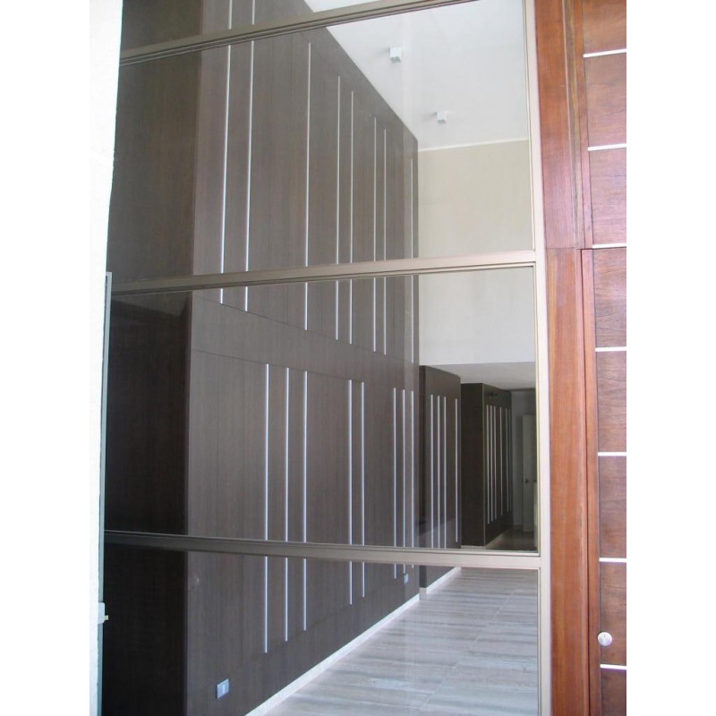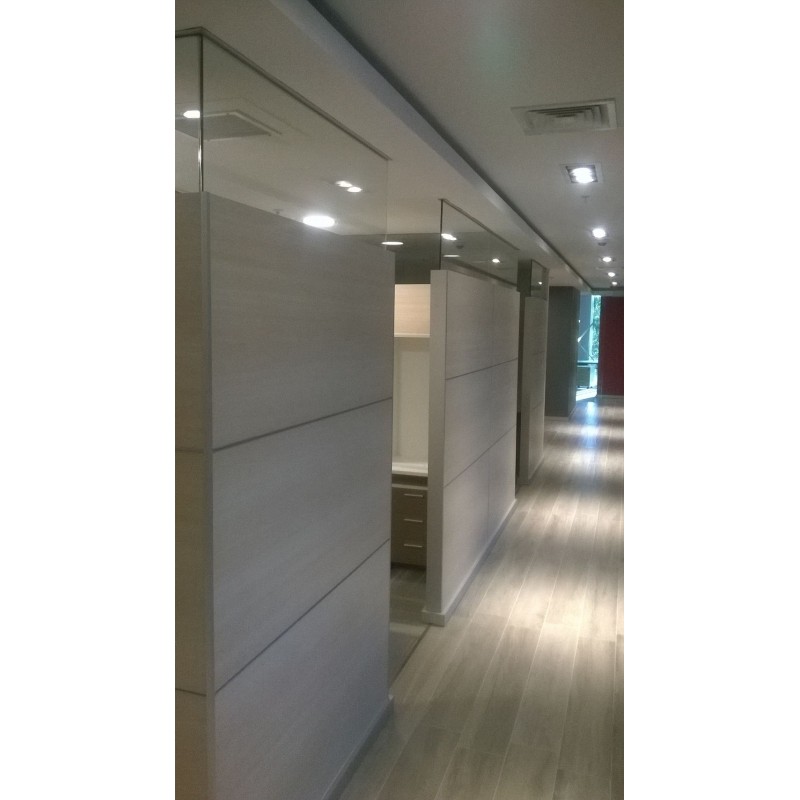 MELAMINA ROBLE OSCURO EN HALL DE ENTRADA Y PASILLOS DE ASCENSOR DE TODOS LOS PISOS, CON CANTERÍAS DE ALUMINIO.